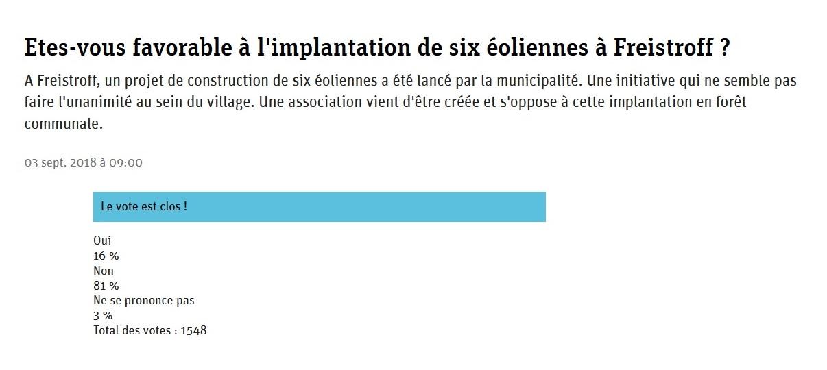 81% des 1548 votants contre le projet éolien selon un sondage effectué par le Républicain Lorrain le 03 septembre